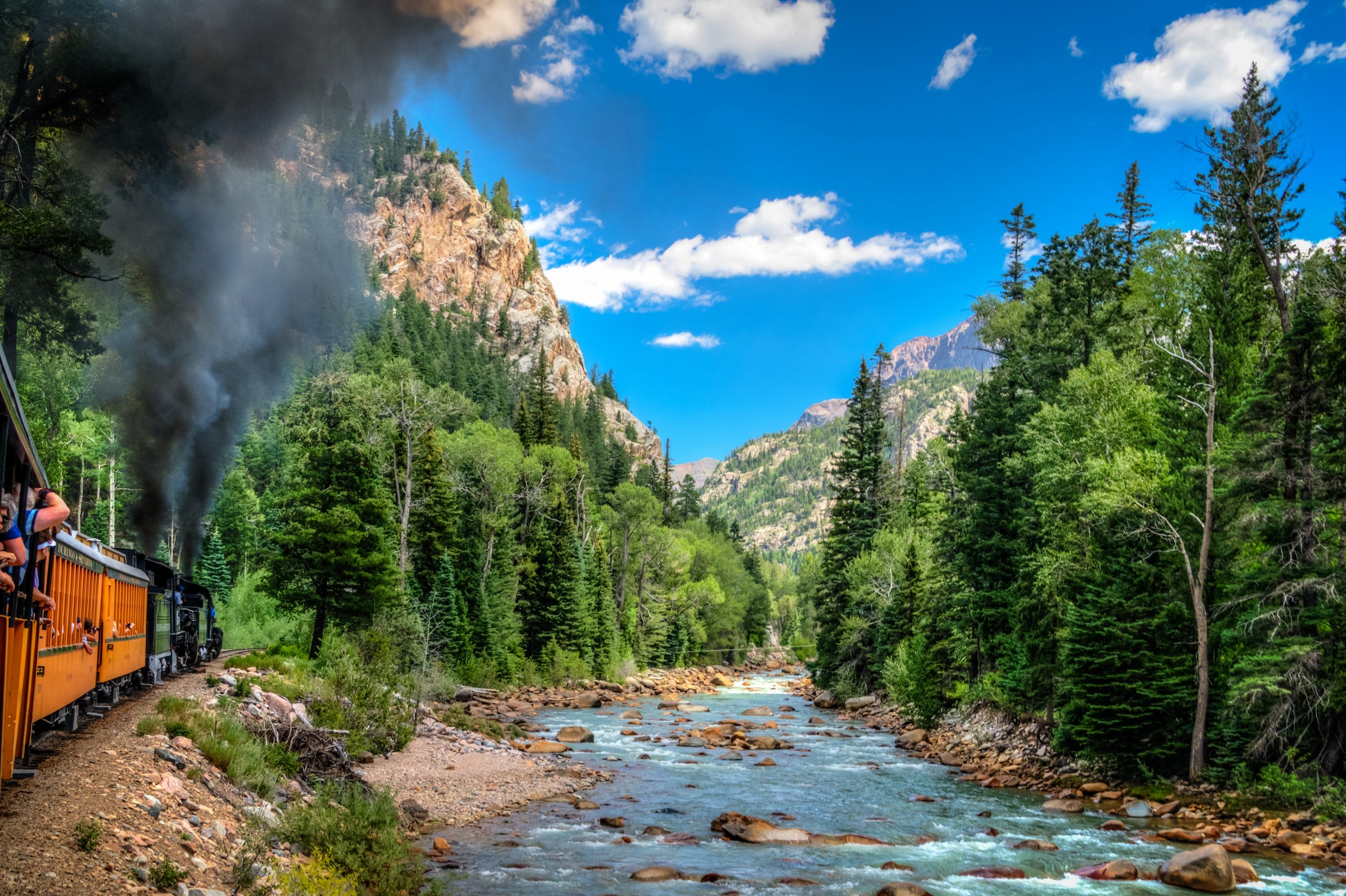 We boarded the Durango & Silverton Narrow Gauge Railroad in Durango headed up to Silverton. This route encounters a climb of about 3,000 feet in elevation so two engines were needed to pull the train. Midway along our route the second engine was disconnected and we proceeded with only one engine pulling the load.