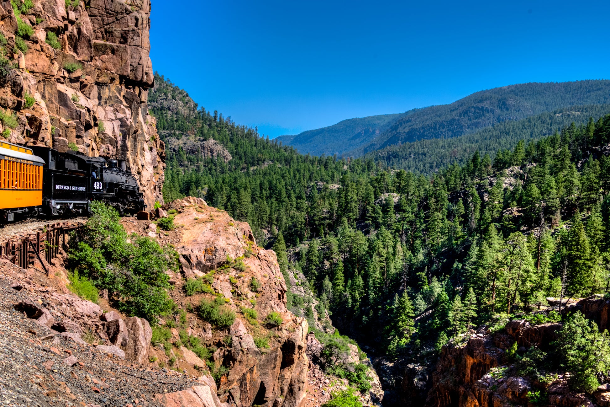 We took a fun family jaunt on the Durango & Silverton Narrow Gauge Railroad. This shot was taken from my seat about six cars back from the engine on a high cliff between Durango and Silverton, Colorado. It's a very picturesque excursion that I highly recommend taking if you have a chance.